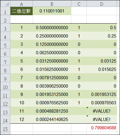 (2) 儲存格C3:=MID($B$1,ROW(3:3),1),複製儲存格C3,貼至儲存格C3:C14。取出小數點後的每一位數字(1或0)