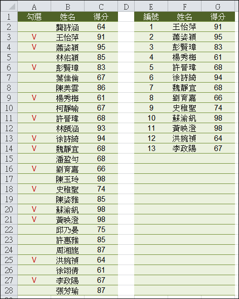 在 Excel 中有一個資料表(如下圖左),如果要根據勾選的結果,自動依序列出有勾選的人員名冊,並列出編號、姓名、得分(參考下圖右),該如何處理?