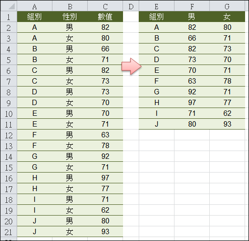 在 Excel 中有一個依組別和男/女所記錄的數值資料表(如下圖左),如何轉換成下圖右的格式呢?