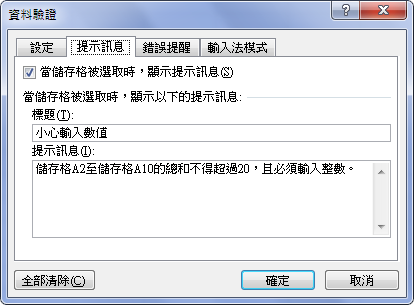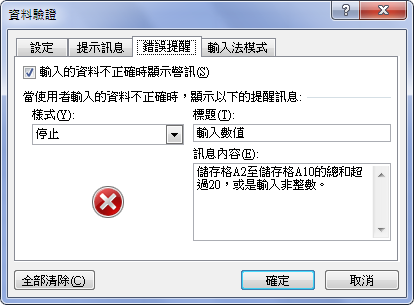 在[錯誤提醒]標籤下輸入提示訊息: