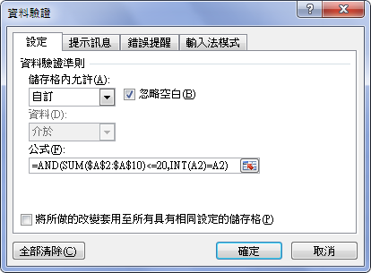 4. 在[公式]文字方塊中輸入「=AND(SUM($A$2:$A$10)<=20,INT(A2)=A2)」。