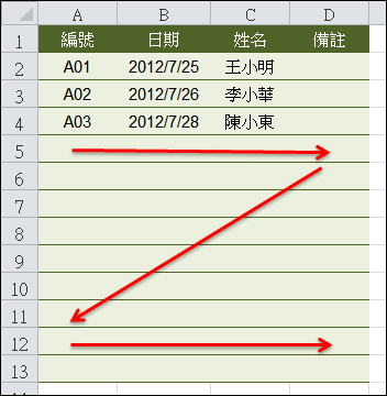 在 Excel 中有一個資料表(參考下圖),如果在輸入資料時,想要依記錄逐一輸入資料,即儲存格A2輸入後,按下 Enter 鍵,會自動移到儲存格B2,再按 Enter 鍵,移至儲存格C2, D2,再按 Enter 鍵會移至儲存格A5。參考下圖的輸入順序,在 Excel 中該如何處理?