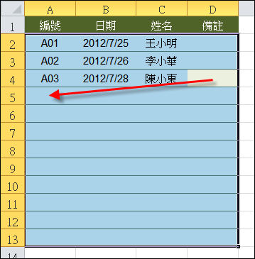 當你要輸入資料時,先選取資料範圍,例如:儲存格A2:D13。當你輸入資料後按下 Enter 鍵,會自動移至右邊的儲存格。因為已選取一個儲存格範圍,所以在最右邊的儲存格(例如:儲存格D4)按下 Enter 鍵,則會移至下一列的第一個儲存格(例如:儲存格A5)。