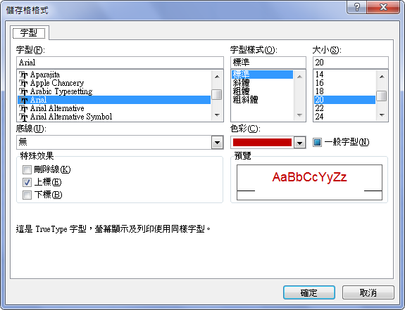 註:如果你選取儲存格,再選取[儲存格格式]對話框中的「一般字型」選項,可以將所有的字型格式設定取消,回復預設值。