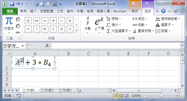 其實在 Excel 2010 中已提供了插入方程式的功能: