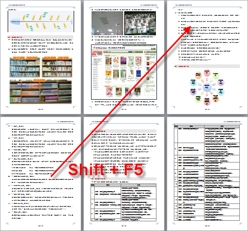 你如果在編輯一份文件時,在某頁輸入一些文字,接著翻頁到其他頁面;或是想要跳到上次最後編輯的位置,只要按一下 Shift+F5 鍵即可。