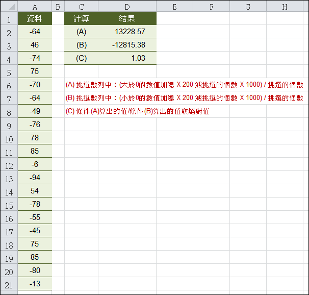 儲存格D3:=(SUMIF(資料,"<0")*200-COUNTIF(資料,"<0")*1000)/COUNTIF(資料,"<0")