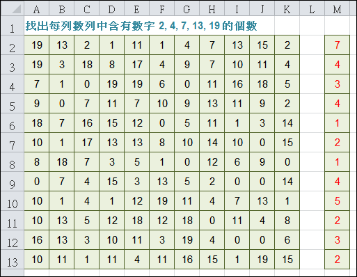 儲存格M2:{=SUM(IF(A2:K2={2;4;7;13;19},1,0))}