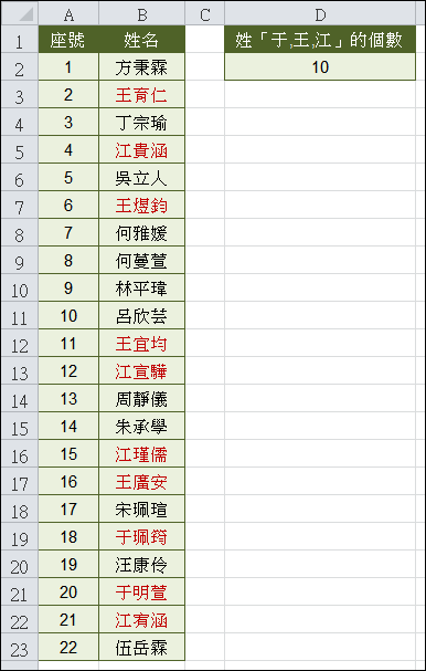 儲存格D2:{=SUM(IF(LEFT(姓名,1)={"于","王","江"},1,0))}