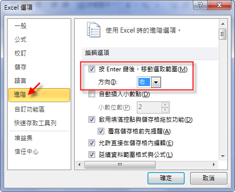 3. 在[進階]標籤下,在[按 Enter 鍵後,移動選取範圍]項下,指定方向為「右」。