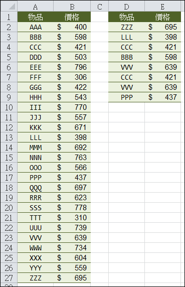 (1) 儲存格E2:=INDEX(價格,MATCH(D2,物品,0),1)