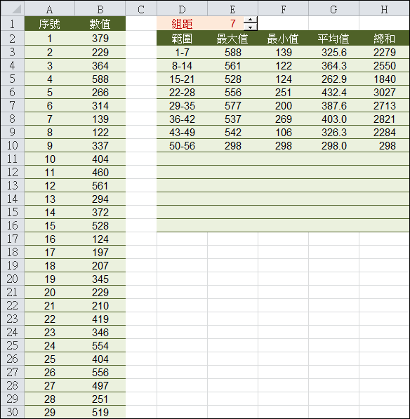 在 Excel 中有一個資料表(如下圖左),根據不同組距值,要自動顯示範圍、最大值、最小值、平均值和總和(如下圖右),該如何處理?