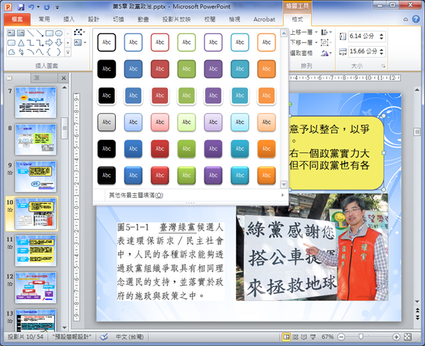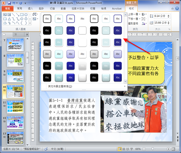 提醒:當你切換不同的佈景主題時,原來文件中的色彩會跟著改變。