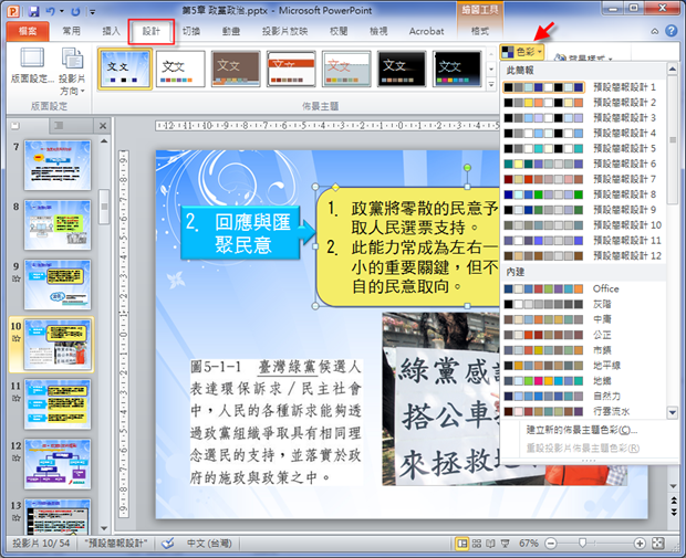 你只要在[設計]功能表中選取一種喜歡的佈景主題,或是自訂一個新的佈景主題: