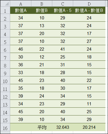 有網友問到,在 Excel 的資料表中有二個數列:數列 A、數列 B (如下圖),如果想要求取數列 A 中每個數字減 5 後的數值平均,和數值 A 減數值 B 後的平均,該如何處理呢?