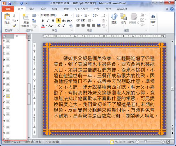 今天同仁要我協助將一份簡報中的全部投影片裡文字全部擷取出來(參考下圖),因為在這麼多張投影片中以複製(Ctrl+C)和貼上(Ctrl+V)方式,也要花掉不少時間,而且選取文字也要花掉一些時間,有什麼好方法呢?