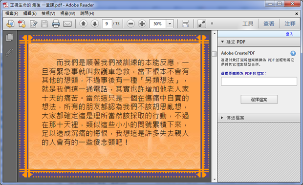 試著將其另存新檔為 PDF 檔,可是每次選取文字時,只能以單張投影片為選取範圍,無法一次選取多張投影中的文字。該作法也是失敗!