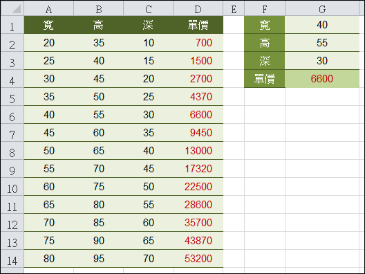 有網友留言問到:在 Excel 中,如果要在一個含有「寬、高、深、單價」的資料表中,想要以輸入「寬、高、深」來求得單價(參考下圖),該如何處理?