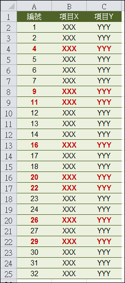 有人問到:在 Excel 的資料表中,想要在一堆排好順序的資料裡,找尋有跳號(不連續)的地方,該如何處理(參考下圖)?本例可以使用「設定格式化的條件」來找出不連續的位置。