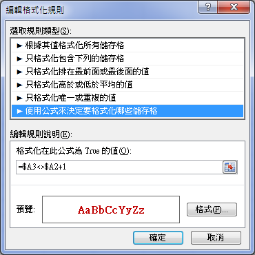 公式中必須要將A欄設定為絶對參照,如此B欄和C欄符合條件者,才會顯示格式。