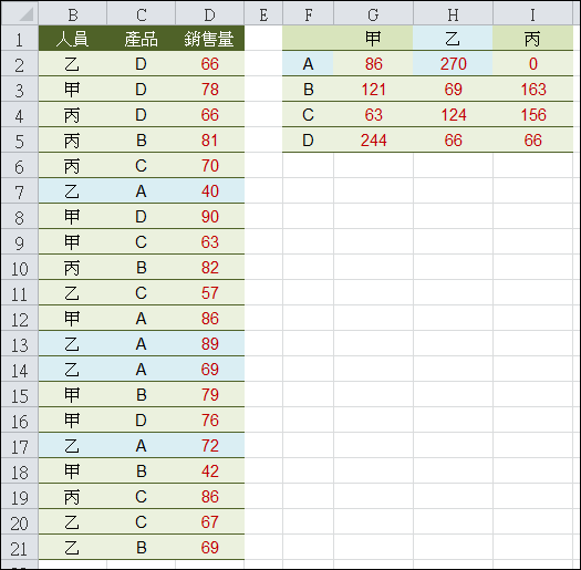 儲存格G2:=SUMPRODUCT(銷售量*(人員=G$1)*(產品=$F2))