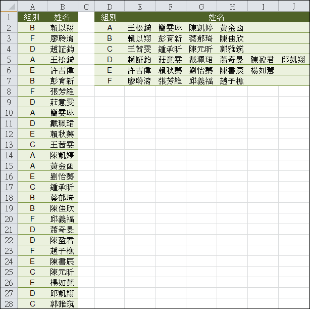 INDIRECT(ADDRESS(SMALL(IF(組別=D2,ROW(組別),FALSE),COLUMN(A:A)),2)):透過 INDIRECT 和 ADDRESS 函數查表得到姓名。