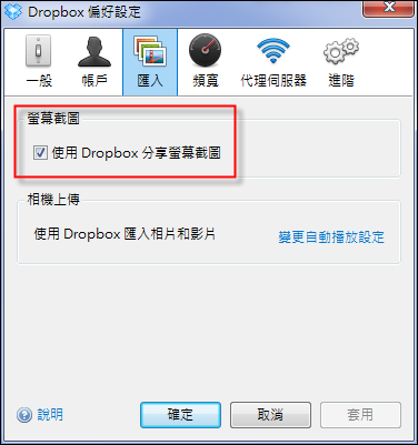 安裝好 2.4 版後,可以勾選「使用 Dropbox 分享螢幕截圖」,當抓下螢幕截圖時,可以立即上傳至 Dropbox 雲端硬碟。