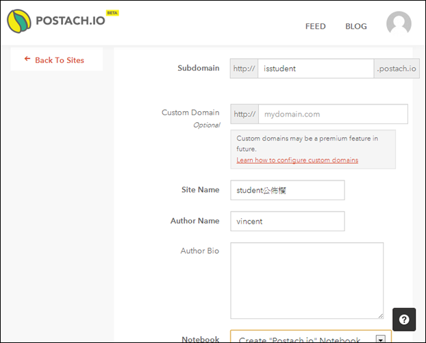 為這個部落格設定一個子網域名稱(http://ABCD.postach.io,填入ABCD,想個好記的名稱吧!),及指定這個部落格對應的記事本(建議先在個人的 Evernote 中建立一個這個部落格專用的「記事本」,而使用系統內建的「postach.io」記事本):