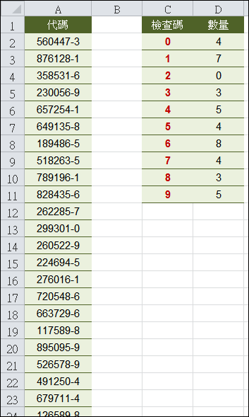 儲存格D2:=SUMPRODUCT(--(VALUE(RIGHT(代碼,1))=ROW(1:1)-1))