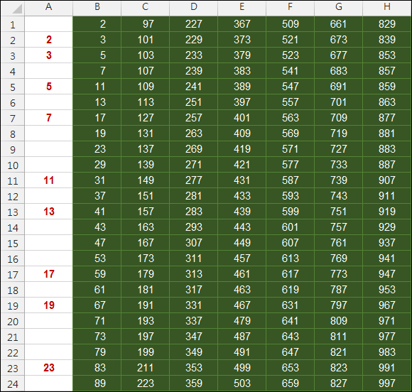 儲存格A1:{=IF(ROW(1:1)=2,2,IF(ROW(1:1)=3,3,IF(PRODUCT(MOD(ROW(1:1),ROW($A$2:INDIRECT("A"&INT((ROW(1:1))^0.5)))))<>0,ROW(1:1),"")))}