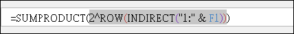 SUMPRODUCT(2^ROW(INDIRECT("1:" & F1)))