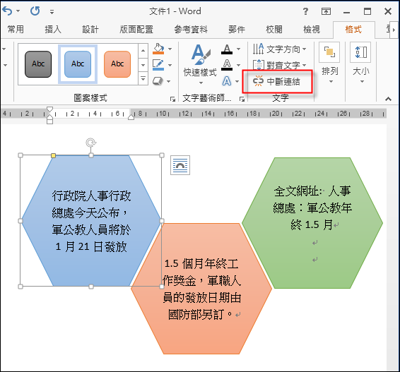 三個文件將可以接連顯示同一段文字內容。如果想要中斷連結關係,則只要選取物件後,點選[格式/文字/中斷連結]即可。