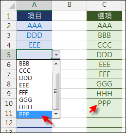 如此,只要在選項的儲存格範圍中新增一筆資料時,選單中也會同步增加一個選項,而且不會出現一些空白項。