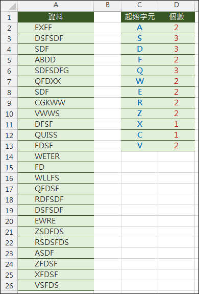 有網友想要在如下的資料表中,統計特定起始字元的資料個數,該如何處理?
