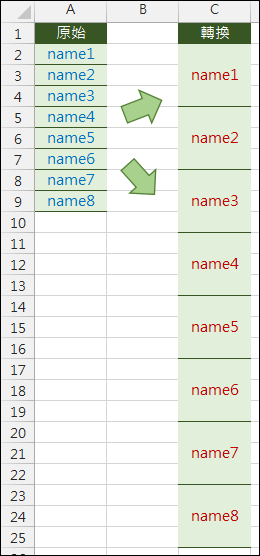 儲存格C2:=OFFSET($A$2,INT(ROW(1:1)/3),,,)