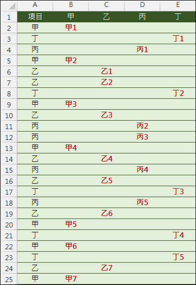 儲存格B1:{=IF($A2=B$1,B$1&SUM(--(B$1:B1<>"")),"")}