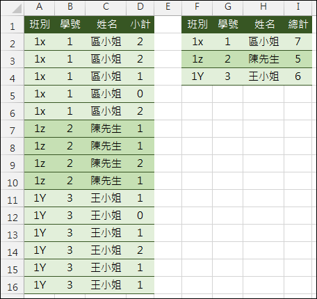 儲存格I2:=SUMPRODUCT((C2:C16=H2)*D2:D16)