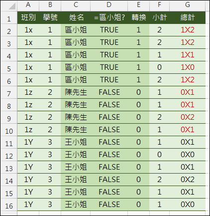 在 SUMPRODUCT 函數中使用 SUMPRODUCT((=區小姐?)*(小計)),其中的「*」運算,可以將邏輯運算結果的 TRUE/FALSE 陣列,轉換為 1/0 陣列,再和「小計」一起計算其「乘積和」。