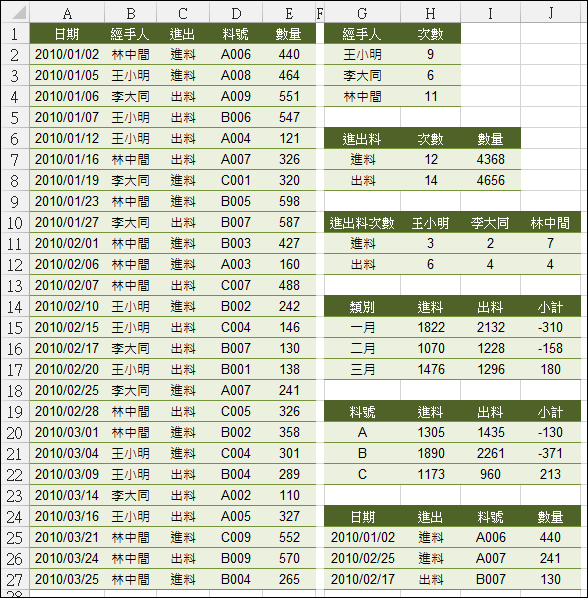 網友根據另一篇:Excel-條件式加總練習(SUMIF+COUNTIF),想要詢問不同人員之進料/出料次數。以下補充該部分的公式。