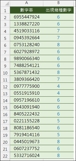 如果想要計算在 Excel 的儲存格中共出現幾種數字,該如何處理?數字是由 0, 1, 2, ..., 9 所組成。(參考下圖)