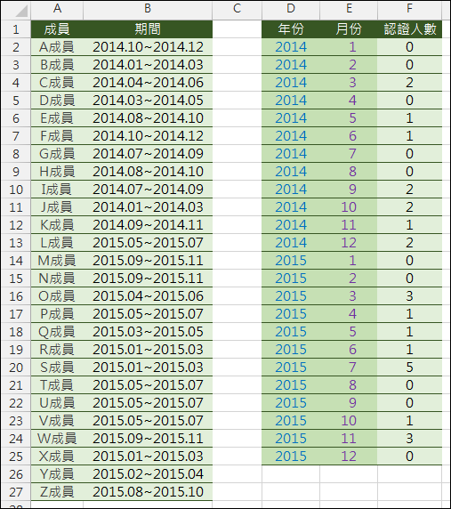 有網友問到:在 Excel 的工作表中有一個認證期間的日期數列,而這個日期數列是由兩個日期組成的文字(參考下圖右),現在希望能在這個數列中分年分月的計數人數,該如何處理?(參考下圖左)(認證完成日以期間最後的年月份為準)