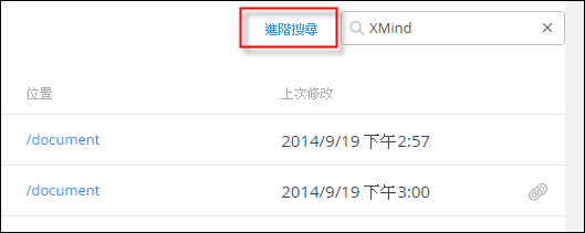 按一下「進階搜尋」,即可使用「包含其中一個單字」、「不包含其中任何一個單字」、「精確對應字詞」、等搜尋條件,也可調整搜尋範圍:檔案、資料夾、已刪除的項目: