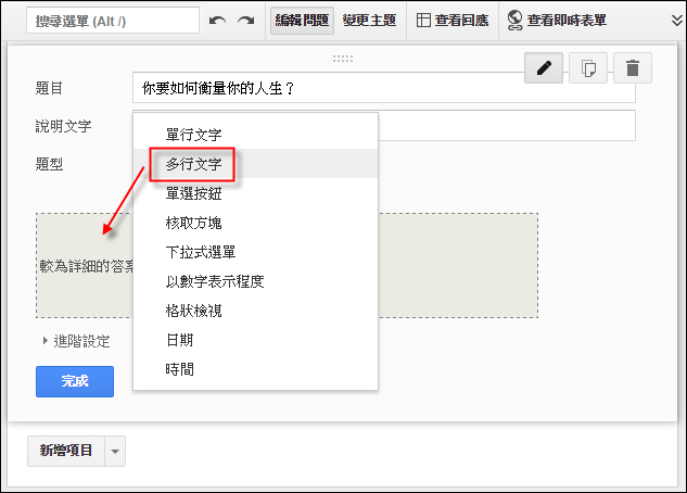 5. 在[題型]下拉式清單中選取「多行文字」。