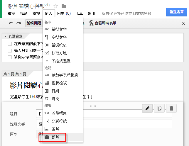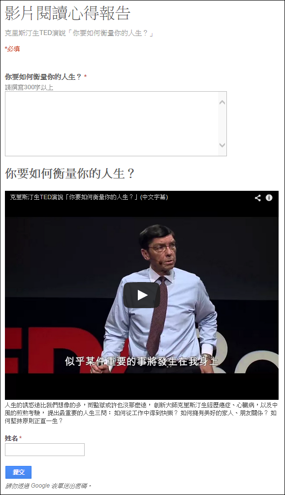 17. 如果想要把這個內容放在自己的部落格中讓學生填寫,只要按一下上圖中的「內嵌」,即可複製 HTML 程式,則貼至自己的部落格中。