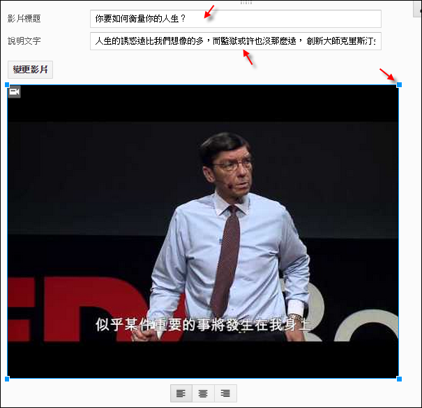11. 輸入「影片標題」和「說明文字」等內容,並且調整影片的大小。