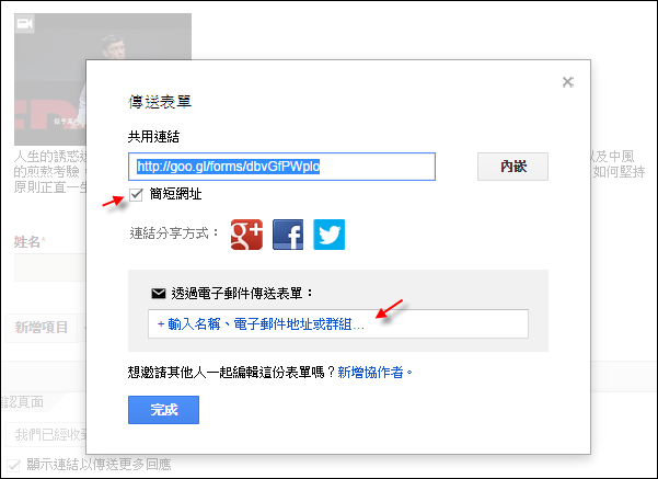 16. 按一下上圖中的「傳送表單」,然後勾選「短網址」,即會產生一個共用連結。