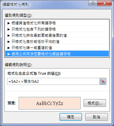 輸入規則:=A2<>預估!A2 (注意絶對位址符號 的使用)