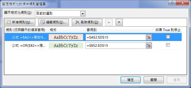 輸入規則:=OR(B2<>預估!B2,C2<>預估!C2,D2<>預估!D2)