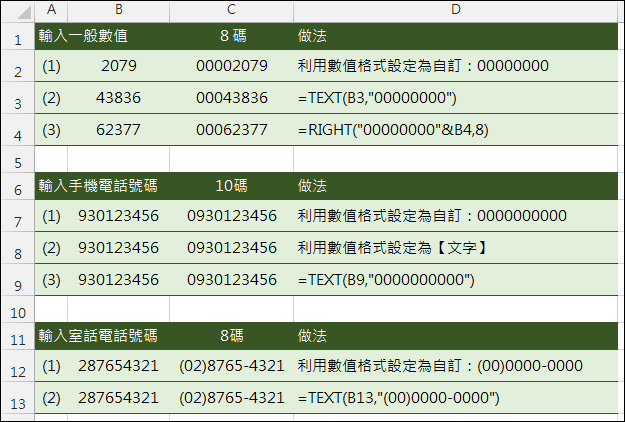 如果使用「數值格式設定」的方式,則可以保留原來輸入的數值不被改變,只會改變顯示的結果,例如,若輸入數字 2079,儲存格的數值格式設定為「00000000」,則會顯示為「00002079」。