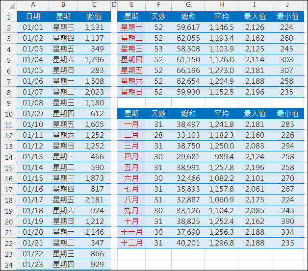 在一年的開始,很多人開始要對去年的報表加以統計了。常有人問到這類的例題,在 Excel 中有一個每天的數值記錄產生的報表(參考下圖左),如何分星期、分月份來統計:天數、總和、平均、最大值、最小值等呢?(參考下圖右)